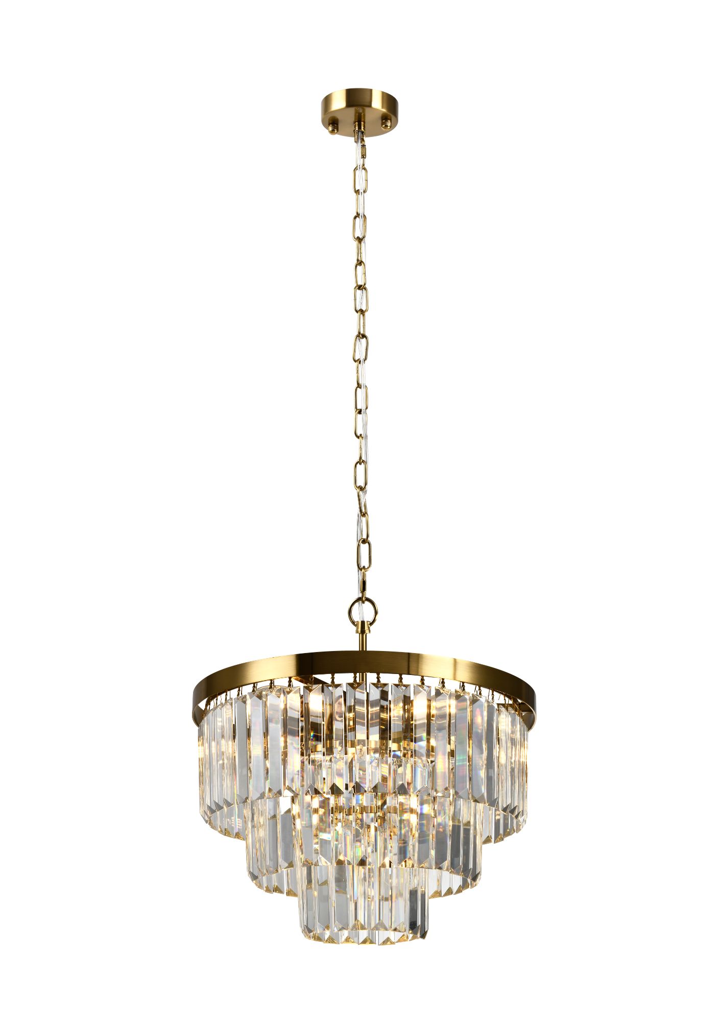 Đèn thả trần pha lê với khung sắt màu vàng champagne mờ, thiết kế nhiều tầng tinh tế. Ánh sáng xuyên qua pha lê tạo hiệu ứng lung linh, mang lại vẻ sang trọng cho không gian.